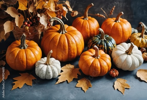 A variety of pumpkins and autumn leaves on a wooden table