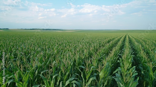 A vast cornfield stretching to the horizon under a bright blue sky, with tall green stalks swaying in the breeze.