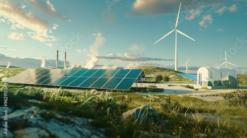 A vast renewable energy site featuring solar panels, wind turbines, and futuristic structures set against a picturesque landscape.