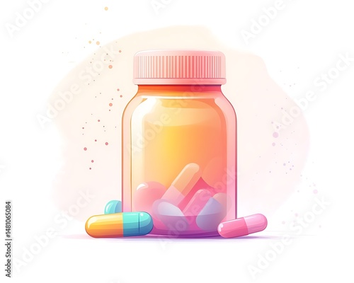 A vector illustration of a vitamin bottle in soft pastel colors, set on a white background to represent health and wellness supplements