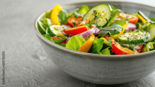 A vibrant and fresh salad featuring crisp vegetables, colorful peppers, and greens, perfect for healthy meals and lifestyle.