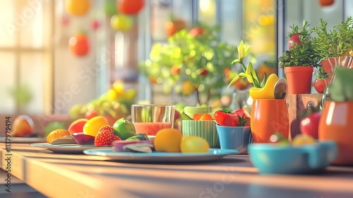 A vibrant arrangement of fresh fruits and vegetables in a sunlit indoor setting, showcasing colors and textures.