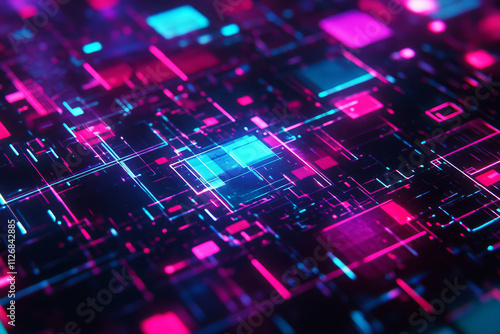 A vibrant background featuring glowing geometric grids in vibrant cyan and purple over a sleek black field.