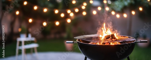 A vibrant barbecue grill with flames, set in a cozy outdoor space adorned with string lights, perfect for gatherings.