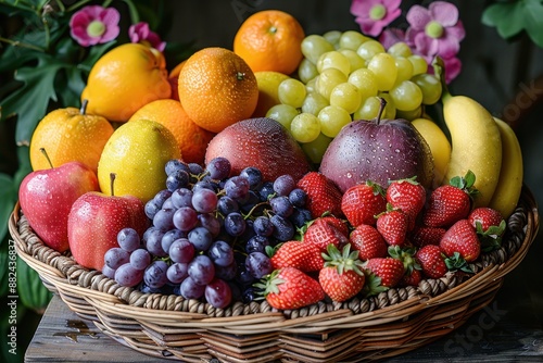 A vibrant basket filled with a variety of fresh fruits including apples, oranges, bananas, grapes, and strawberries, all glistening with morning dew.