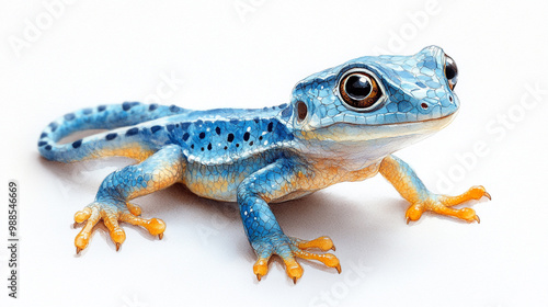 A vibrant blue frog with striking features, showcasing its bright coloration and intricate patterns against a white backdrop.