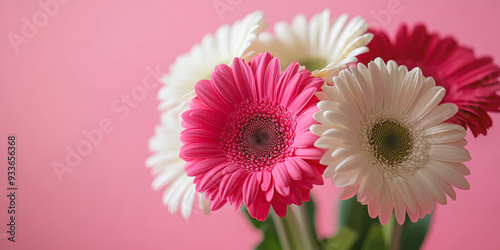 A vibrant bouquet of pink and white gerbera daisies arranged against a soft pink background, showcasing the beauty of these colorful flowers.