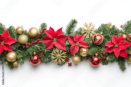 A vibrant Christmas garland made of lush green fir branches adorned with red and gold ornaments