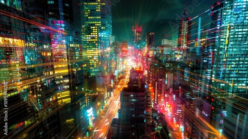 A vibrant cityscape at night, showcasing bright lights and dynamic energy.