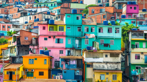 A vibrant cityscape features densely packed, colorful buildings stacked atop one another, highlighting urban diversity and energy.