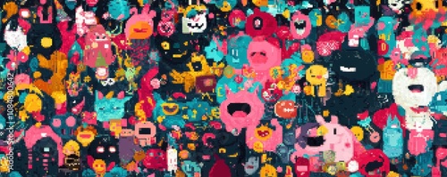 A vibrant collage of cartoonish characters in various colors and expressions.