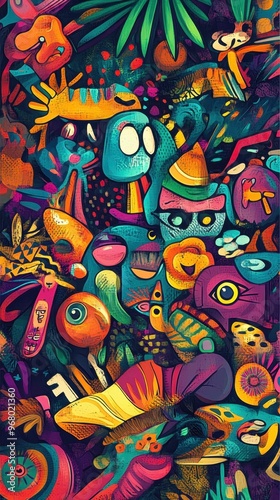 A vibrant collage showcases playful abstract shapes and colors, creating an engaging and dynamic artistic display