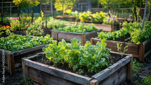 A vibrant community garden with raised wooden planters, diverse green and yellow plants, and a sunny, well-lit outdoor setting.