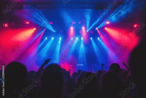 A vibrant concert scene with colorful lights and an engaged crowd.