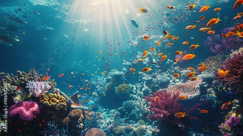 A vibrant coral reef teeming with colorful fish and marine life, with sunlight piercing through the clear blue water from above