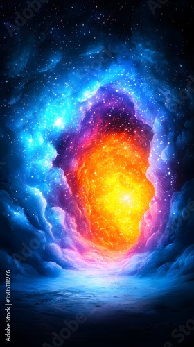 A vibrant, cosmic scene depicts a fiery, glowing core enveloped by swirling nebulae of blues, purples, and oranges, set against a dark, starry expanse