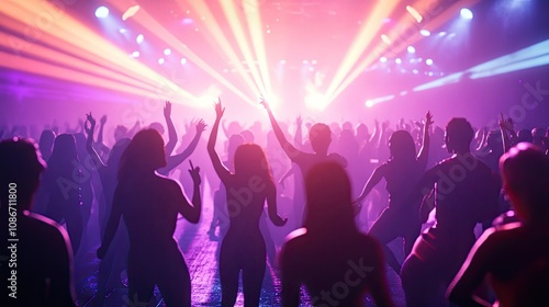 A vibrant crowd of young adults dancing under colorful lights, creating an energetic and joyful atmosphere.