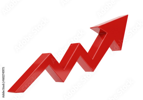 A vibrant deep red glossy 3D arrow, pointing upward-right with sharp angles, against a transparent background with no shadows, indicating financial success concept.