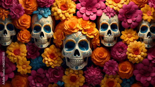 A vibrant Día de los Muertos celebration scene with intricately designed sugar skulls nestled among marigold petals, 3D rendered digital illustration