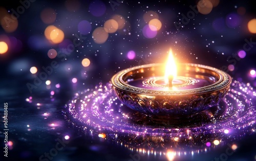 A vibrant Diwali scene with multiple lamps and a dreamy bokeh lights background creating a festive ambiance