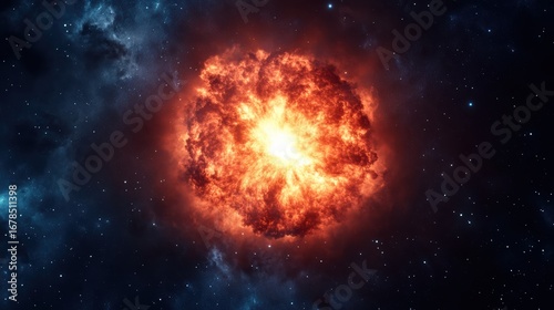 A vibrant explosion in space, showcasing fiery orange and red hues against a dark starry background, representing cosmic phenomena.