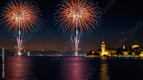 A vibrant fireworks display illuminates the night sky over a city skyline, reflected in the calm waters of a bay.