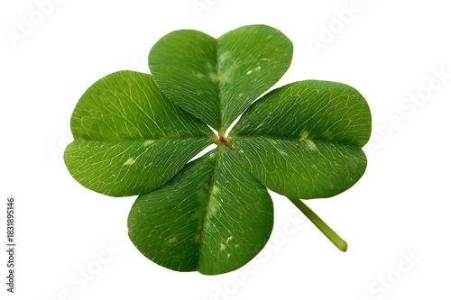 A vibrant four leaf clover isolated against a stark black background