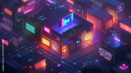 A vibrant, futuristic digital cityscape illuminated with neon lights, showcasing a network of interconnected buildings and screens.