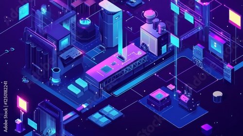 A vibrant, futuristic digital landscape depicting an industrial environment with technology elements.