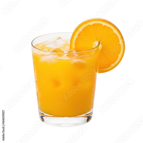 A vibrant glass of freshly squeezed orange juice with ice cubes and a bright orange slice garnish, ready to refresh on a hot day. Ideal for health, food, and beverage concepts.