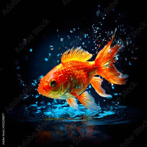 A vibrant goldfish stands out in a dark, reflective aquatic environment illuminated by blue light.