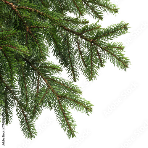 A vibrant green fir branch with dense needles isolated against a solid black background ideal for seasonal and holiday designs
