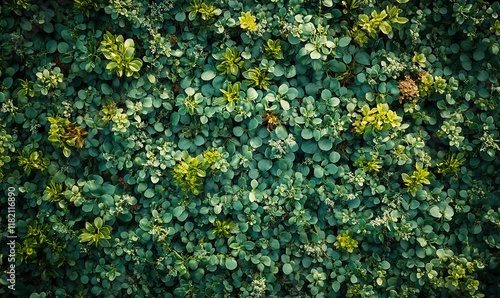 A vibrant green plant cover, showcasing various small leaves and textures in a natural setting.