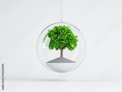 A vibrant green tree suspended in a glass orb, symbolizing environmental preservation