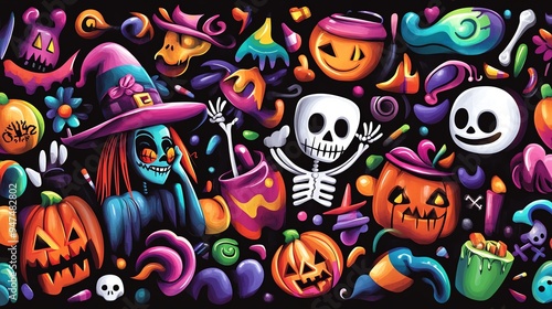 A vibrant Halloween scene featuring pumpkins, ghosts, skeletons, and witches, perfect for spooky celebrations and decorations.