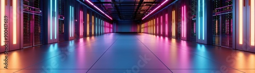 A vibrant hallway with neon lights, showcasing a futuristic atmosphere perfect for digital and technology themes.