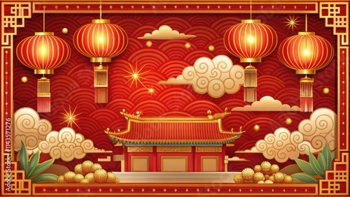 A vibrant illustration featuring traditional Chinese lanterns, clouds, and an ornate building against a red background, symbolizing festive celebrations.