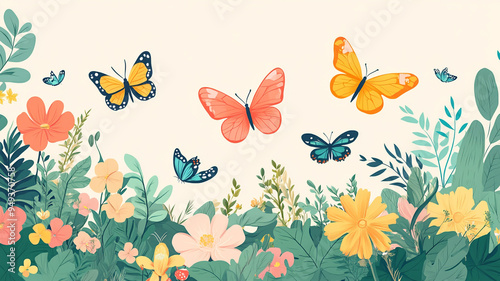 A vibrant illustration of colorful butterflies fluttering among lush flowers in a serene garden setting during a sunny day