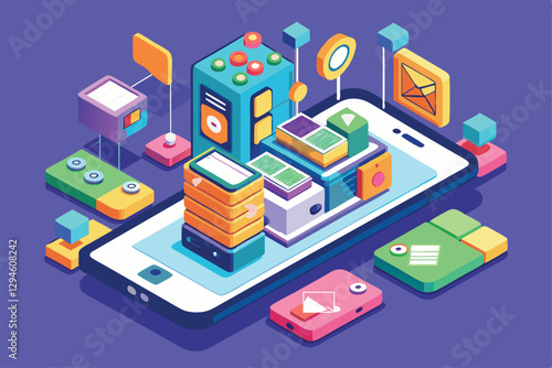 A vibrant isometric illustration depicts a customizable mobile wireframe filled with app design elements, Mobile wireframe Customizable Isometric Illustration