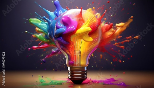A vibrant light bulb explodes with splashes of colorful paint, symbolizing creativity and innovation in a striking visual presentation.