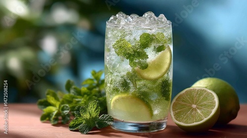 A vibrant mojito is served with fresh mint leaves and lime slices, surrounded by a relaxed atmosphere. Enjoy this cool drink during warm summer afternoons for an ultimate refreshing experience