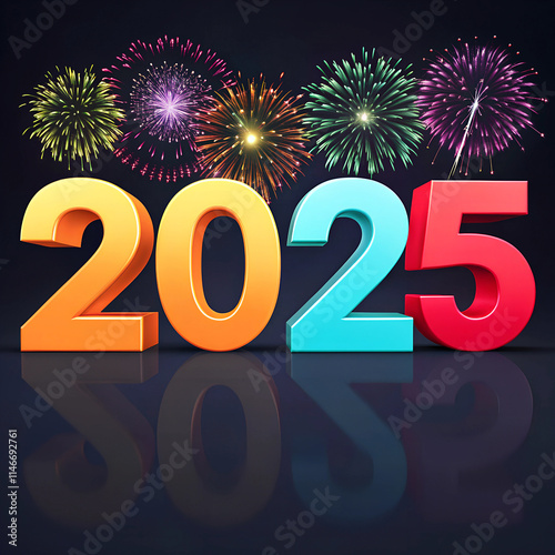 A vibrant New Year's Eve celebration featuring illuminated "2025" 3D lettering with stunning red and gold fireworks in the night sky, reflected over a calm waterfront. Perfect for festive, holiday