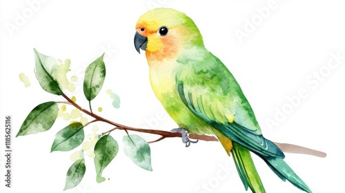 A vibrant parrot perched on a branch, showcasing colorful feathers and a lively expression in a watercolor style.