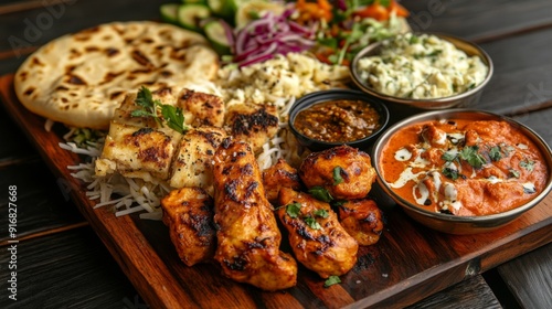 A vibrant platter featuring popular Thai and Indian dishes like Pad Thai, Butter Chicken, and naan bread, all beautifully presented together.