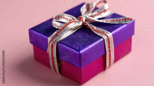 A vibrant purple and pink gift box with a silver and red ribbon, set against a soft pink background.