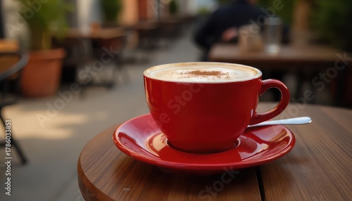 A vibrant red cup of cappuccino with cinnamon on a wooden table at an outdoor cafe setting shot