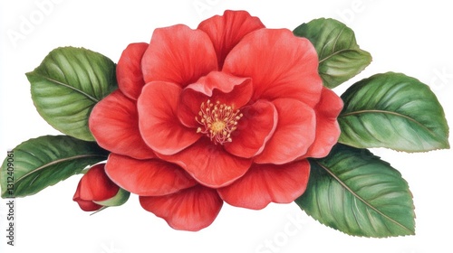 A vibrant red rose with delicate petals is arranged flat, its stem and lush leaves fanned out against a clean white background.