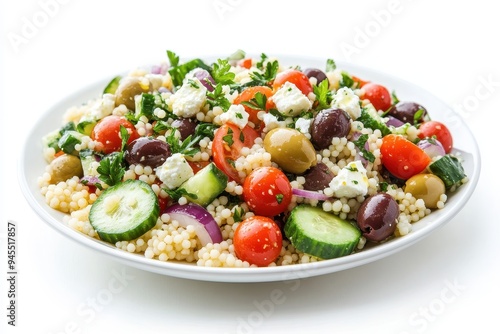 A vibrant salad featuring couscous, tomatoes, cucumbers, olives, and herbs.