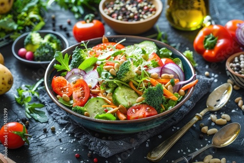 A vibrant salad with fresh vegetables and a homemade dressing