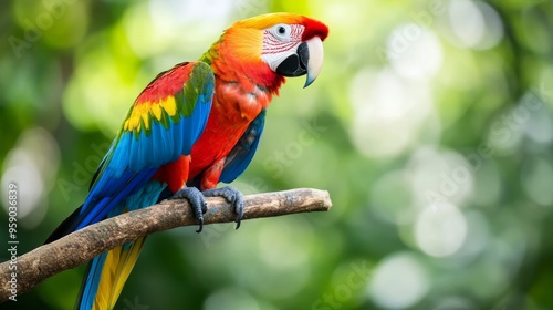 A vibrant scarlet macaw perched on a branch, its plumage a striking contrast against the lush green foliage.